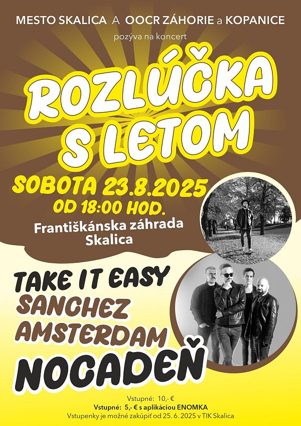 V piatok večer si na nádvorí Vínotéky u františkánov užijete koncert skupiny Impulz, ktorá zahrá piesne na počúvanie aj do tanca. Ak máte chuť na niečo netradičné, navštívte sushi víkend v kaviarni Pod lampou, kde bude prebiehať po 3 dni sushi show priamo pred vašimi očami. Milovníci festivalovej atmosféry si prídu na svoje na Feste Maringota v skalických vinohradoch. V sobotu poobede sa odvážnejšie deti môžu zúčastniť tradičnej strašidelnej prehliadky pamiatok s divadlom B.Ú.D.A., a večer čaká mladých žúrka v štýle Ibiza Vibes na Baťáku s Markom Mazagom. V nedeľu uzavrie víkend rozprávka O Budulínkovi v rámci Artleta. Pokračuje Leto u skalických vinárov a počas víkendu sú otvorené aj vybrané skalické pamiatky.